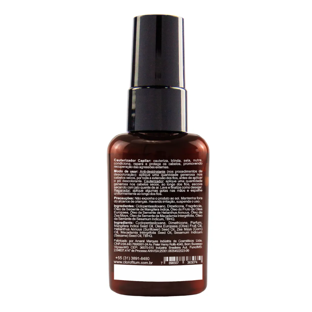 O Cauterizador Capilar óleo de manga e ômega plus foi idealizado para proporcionar tratamento, hidratação, proteção e auxílio no crescimento, mantendo os fios mais saudáveis; protege e evita o corte dos cabelos com pontas ressecadas e bipartidas (capilar), proporcionando restauração através da técnica de cauterização dos fios. Protege contra a perda de água, poluição, vento e danos causados pelo sol. Dentro de um cronograma capilar de cuidados, é o cauterizador capilar Clorofitum mais indicado para a etapa de hidratação.