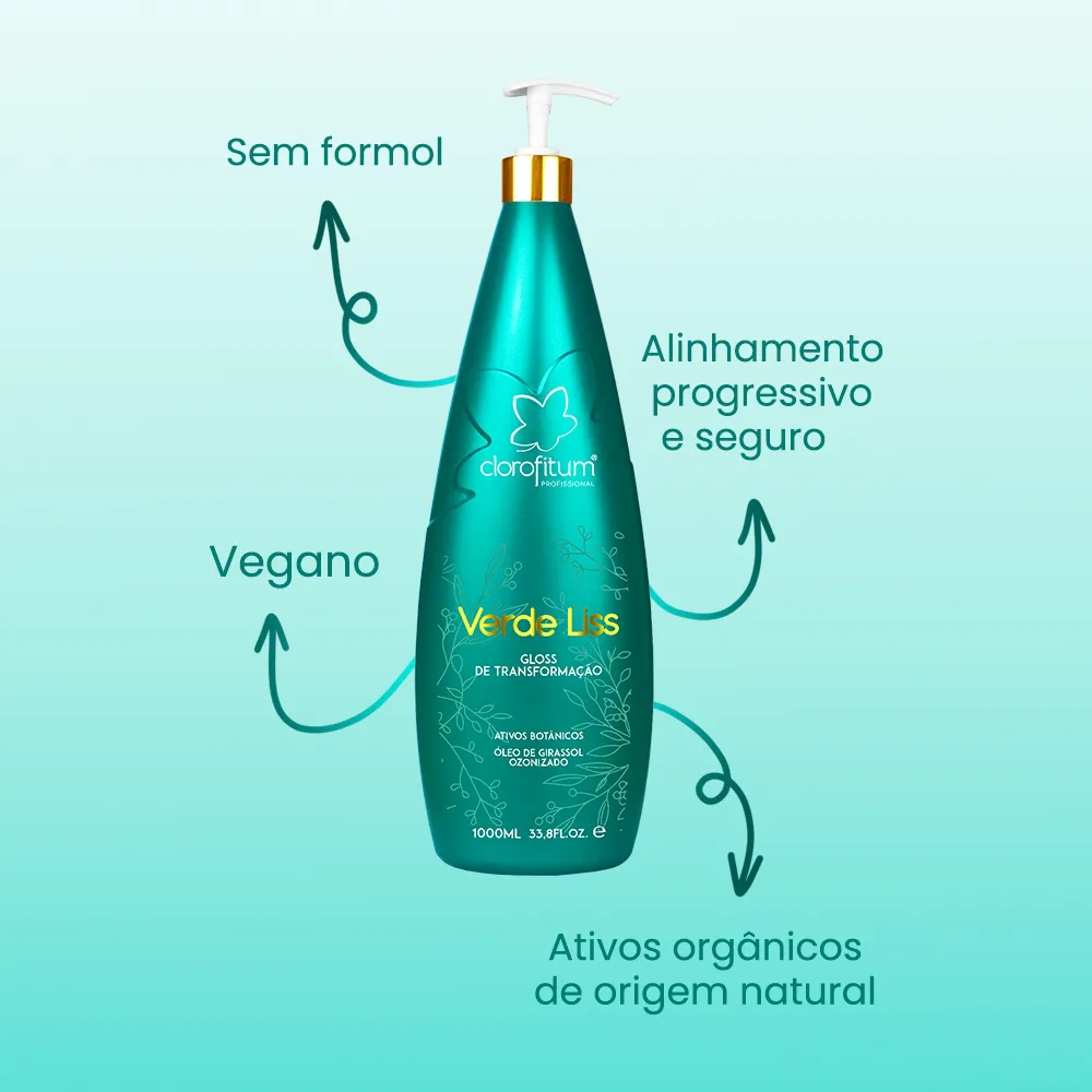 Verde Liss é um poderoso gloss de transformação para alisamento capilar (progressiva) que disciplina, realinha e trata os fios revelando brilho e sedosidade. Sua fórmula inovadora contém óleo ozonizado de girassol, além de um blend de óleos que juntos possibilitam nutrição aos fios desalinhados. Vegano, livre de formol e com ingredientes naturais, promove um alisamento progressivo sem agredir os cabelos.