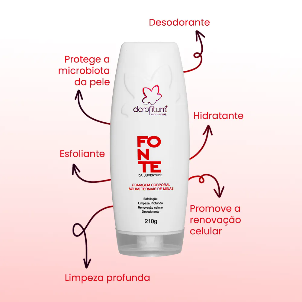 A Gomagem Corporal Fonte da Juventude chegou com tudo com uma fórmula inovadora que esfolia , nutre e hidrata a pele. Dentre os seus ativos estão as Águas Termais e as Plantas da Ressurreição, proporcionando rejuvenescimento da pele, maciez e hidratação.
