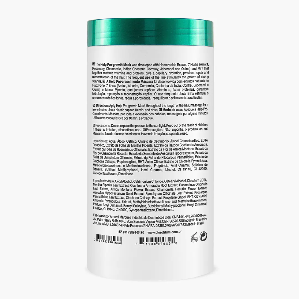 A Máscara Help Pró-Crescimento foi desenvolvida com extratos naturais de Raiz Forte, 7 Ervas (Arnica, Alecrim, Camomila, Castanha da Índia, Confrei, Jaborandi e Quina) e Menta Piperita. Sua fórmula hidrata, repõe vitaminas, fixa proteínas e fecha as cutículas, restaurando a saúde capilar. A linha é indicada para quem busca um crescimento saudável e fios mais fortes.