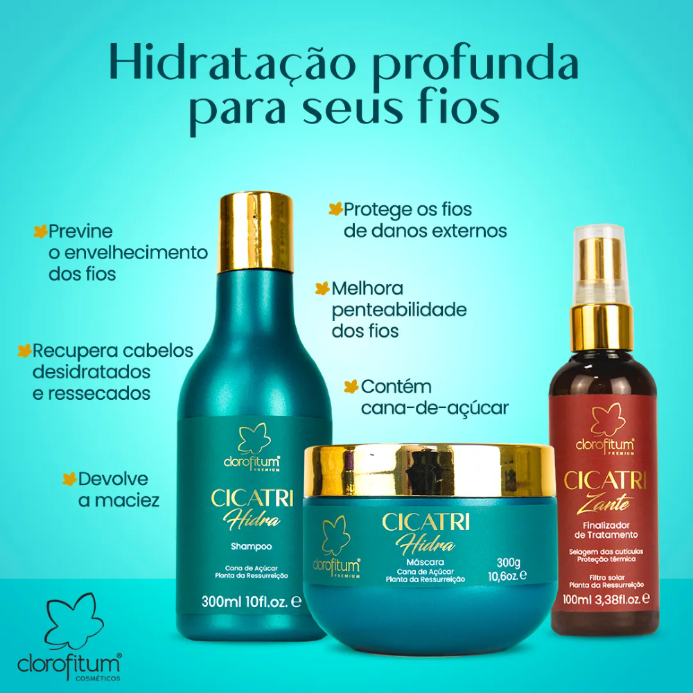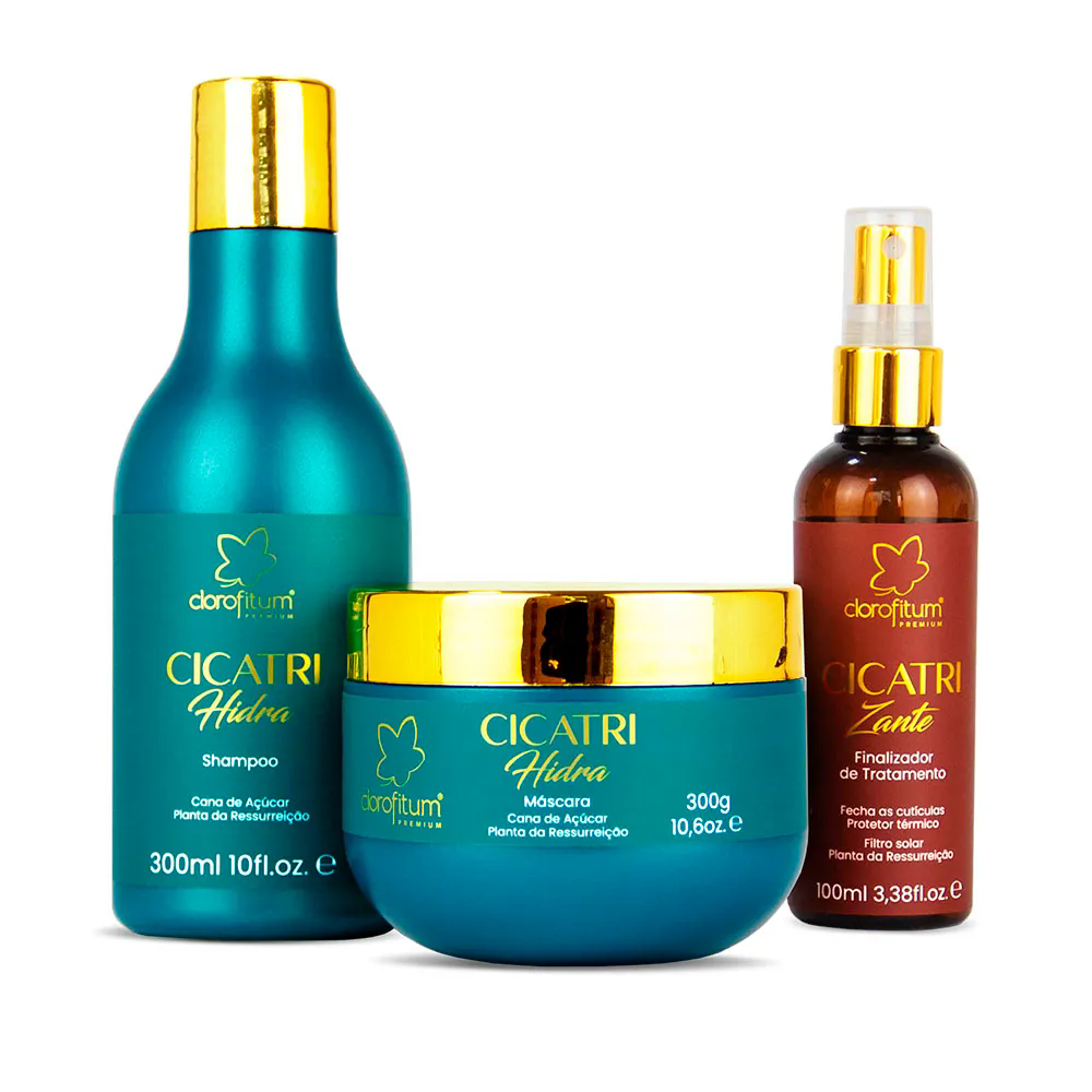 O Kit Cicatri Hidra foi desenvolvido para recuperar a umidade natural dos fios, devolver a maciez e o brilho, e facilitar o desembaraço. Além disso, ele protege da exposição ao sol, vento e calor térmico.