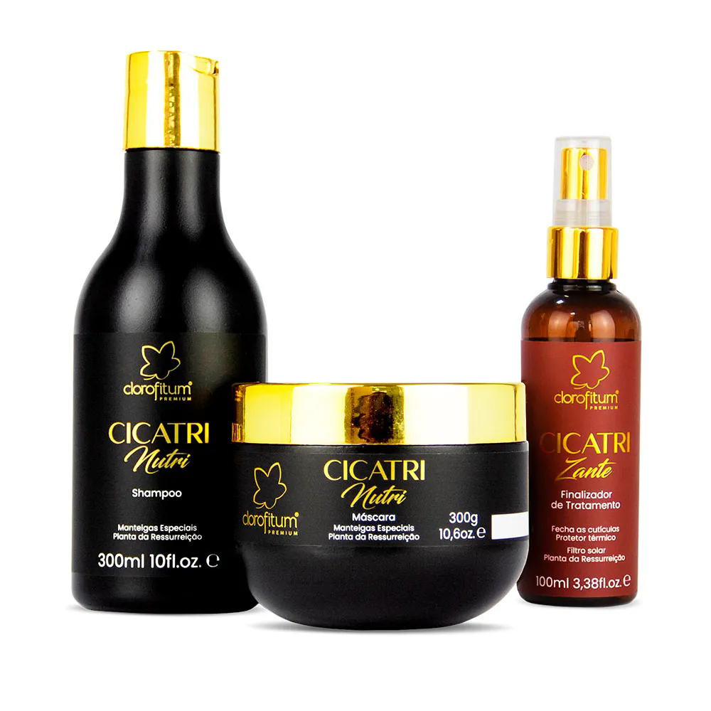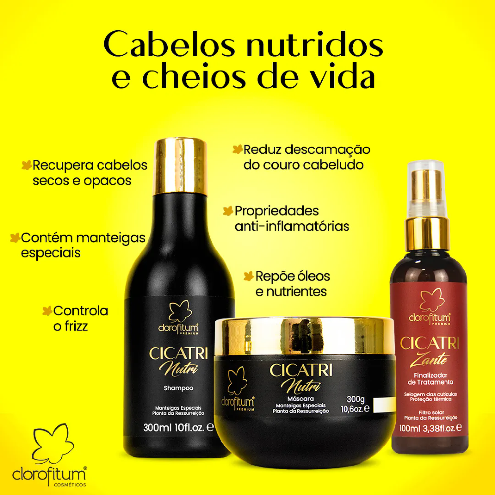 O Kit Cicatri Nutri recupera cabelos secos, opacos e com frizz, devolvendo nutrição, brilho e alinhamento aos fios. Repõe lipídios e nutrientes essenciais, sela as cutículas e revitaliza a fibra capilar com resultados visíveis desde o primeiro uso.