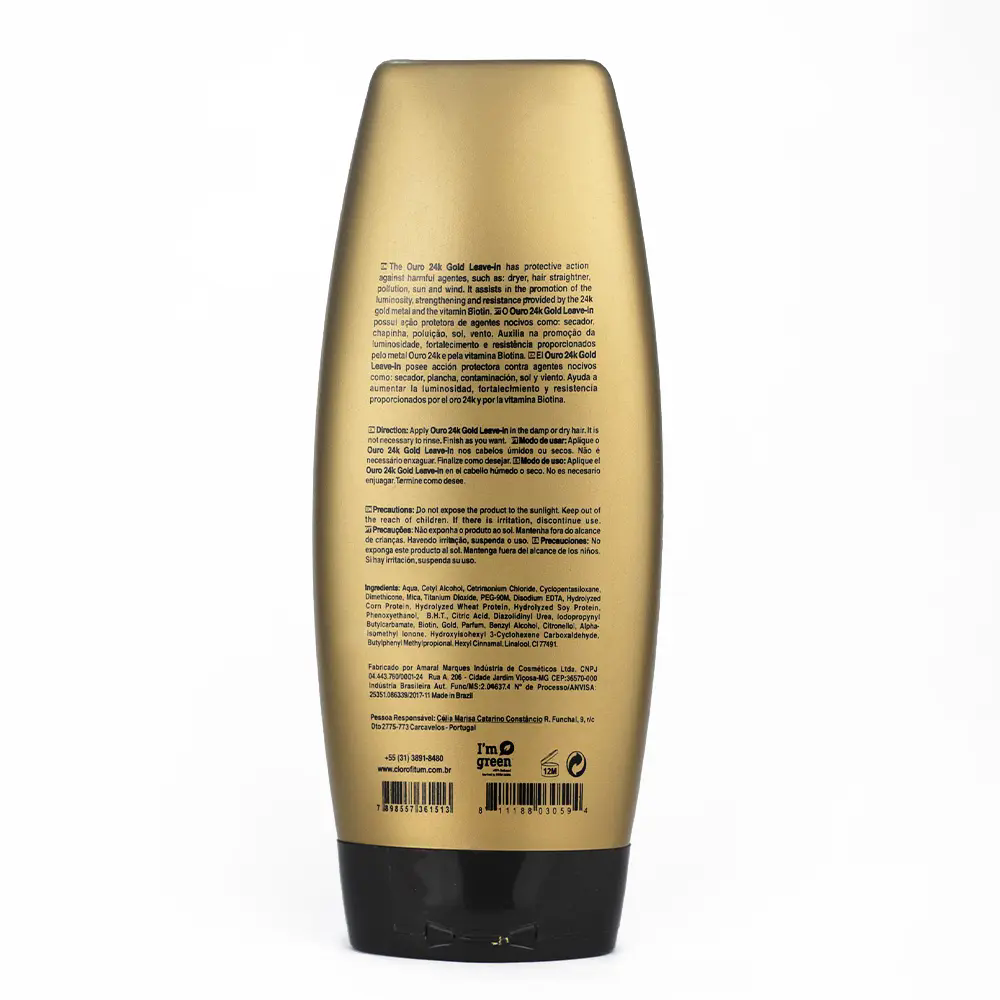 O Ouro 24k Gold Leave-in foi desenvolvido para proporcionar proteção completa aos fios, mantendo-os saudáveis, hidratados e protegidos dos danos diários. Sua fórmula avançada oferece um efeito luminoso e microcristalino, garantindo cabelos mais fortes, com brilho intenso e leveza. Ideal para quem busca proteger os fios contra agentes externos como secador, prancha, poluição e vento, mantendo os resultados dos tratamentos realizados no salão por mais tempo.