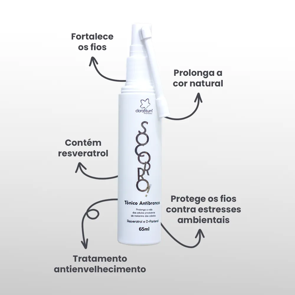 O Tônico Socorro Antibrancos faz parte da Linha Home Care da Clorofitum, com a mesma qualidade da Linha Profissional. Foi desenvolvido especialmente para quem deseja manter o cabelo rejuvenescido, sem uso de químicas. Sua fórmula fortalece o fio, enquanto auxilia no prolongamento da cor natural, evitando o aparecimento dos cabelos brancos.